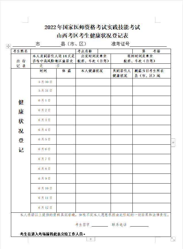 以上就是醫(yī)學(xué)教育網(wǎng)關(guān)于“2022年山西考區(qū)臨床助理醫(yī)師實(shí)踐技能考試《考生健康狀況登記表》下載”的相關(guān)介紹,希望能夠幫助到大家,更多資訊盡在醫(yī)學(xué)教育網(wǎng)!