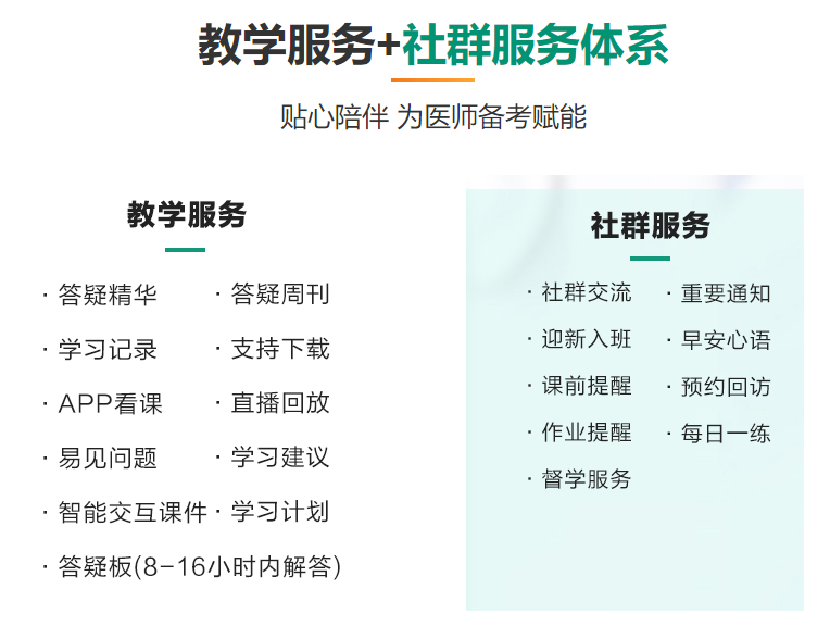 2023年醫(yī)學(xué)教育網(wǎng)醫(yī)師資格考試高效定制班都包含什么?教學(xué)服務(wù)和社群服務(wù)有哪些?相信很多考生都想知道,醫(yī)學(xué)教育網(wǎng)編輯為大家整理了具體的內(nèi)容,并為大家奉上免費(fèi)試聽(tīng)課程,視頻課程地址>>