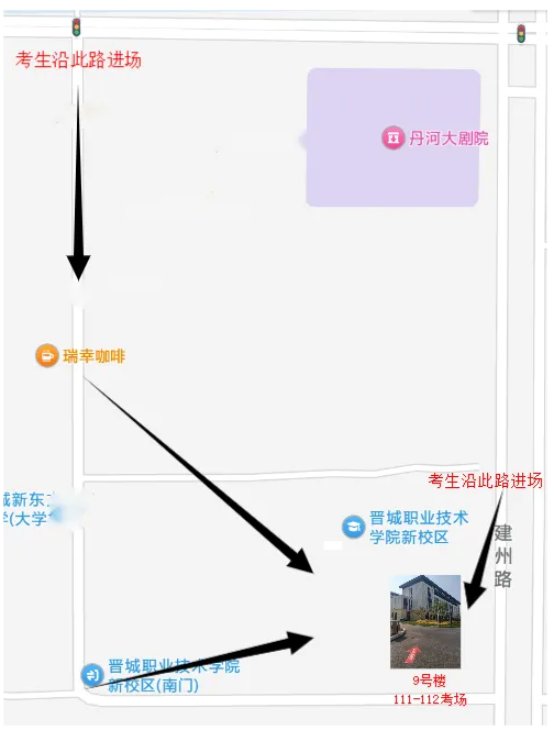 111-112考場(chǎng)在晉城職業(yè)技術(shù)學(xué)院9號(hào)樓4層晉城市丹河新城青山街686號(hào),如下圖所示:
