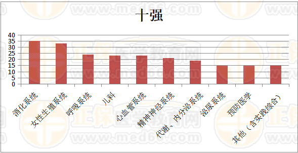 臨床助理醫(yī)師共涵蓋22個(gè)科目,能挺進(jìn)“十強(qiáng)”的,足以證明其“優(yōu)秀”,前五名更是“出類拔萃”,分別是:消化系統(tǒng)、女性生殖系統(tǒng)、呼吸系統(tǒng)、兒科、心血管系統(tǒng)。其中,消化系統(tǒng)占到約35分,“獨(dú)占鰲頭”,所以,消化系統(tǒng)必須掌握好(我們已經(jīng)用事實(shí)說(shuō)話了)?!笆畯?qiáng)”中有一匹“黑馬”是預(yù)防醫(yī)學(xué),它是進(jìn)入“十強(qiáng)”唯一的一門(mén)基礎(chǔ)科目,約能占到15分,可知,我國(guó)對(duì)于“維護(hù)健康、預(yù)防疾病”是多么的看重!“十強(qiáng)”中精神神經(jīng)系統(tǒng)比較難搞定,得分率相對(duì)較低,所以,大家要注意結(jié)合自己的實(shí)際情況安排學(xué)習(xí)時(shí)間。