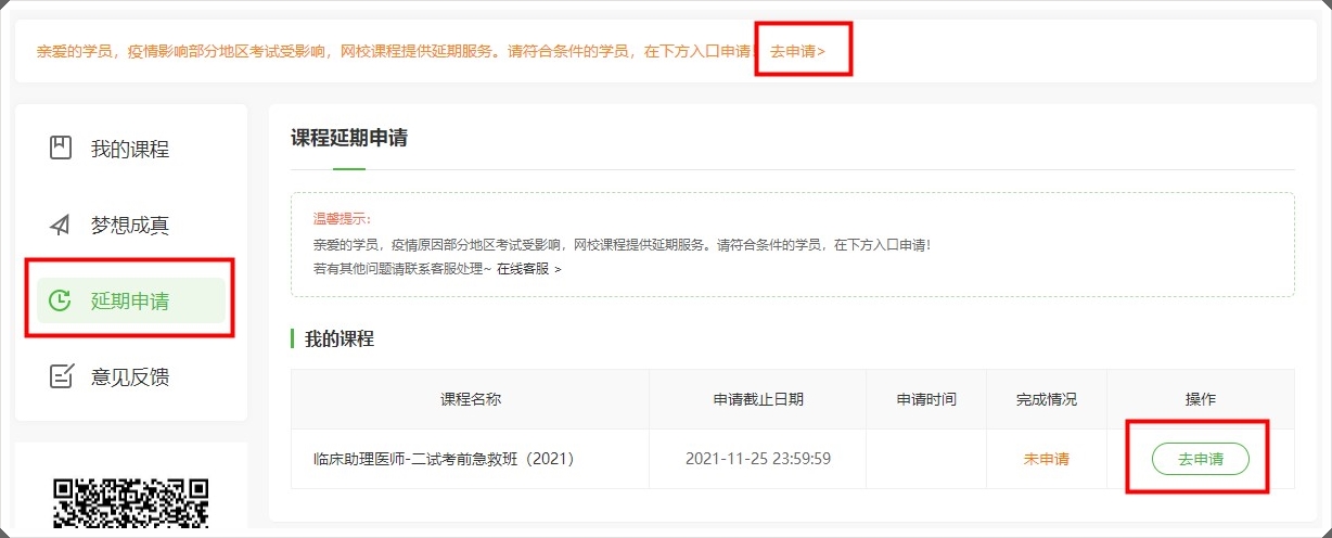 2.選擇您要延期的課程,點(diǎn)擊“去申請(qǐng)”即可進(jìn)入課程延期信息填寫界面?!疤峤弧鄙暾?qǐng)之后,網(wǎng)校會(huì)盡快進(jìn)行審核,請(qǐng)您耐心等待。