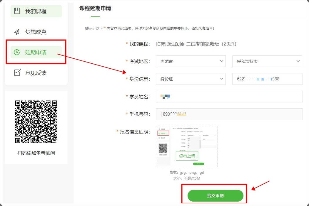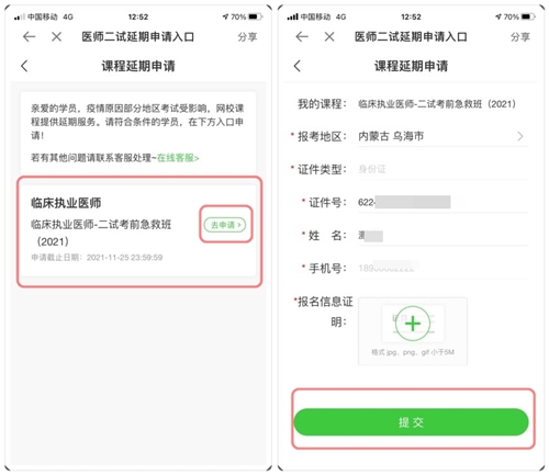2.在要申請(qǐng)延期的課程右側(cè),點(diǎn)擊“去申請(qǐng)”即可進(jìn)入延期申請(qǐng)資料填寫頁面,選擇考試地區(qū),填寫個(gè)人身份證等信息,點(diǎn)擊“提交申請(qǐng)”即可。