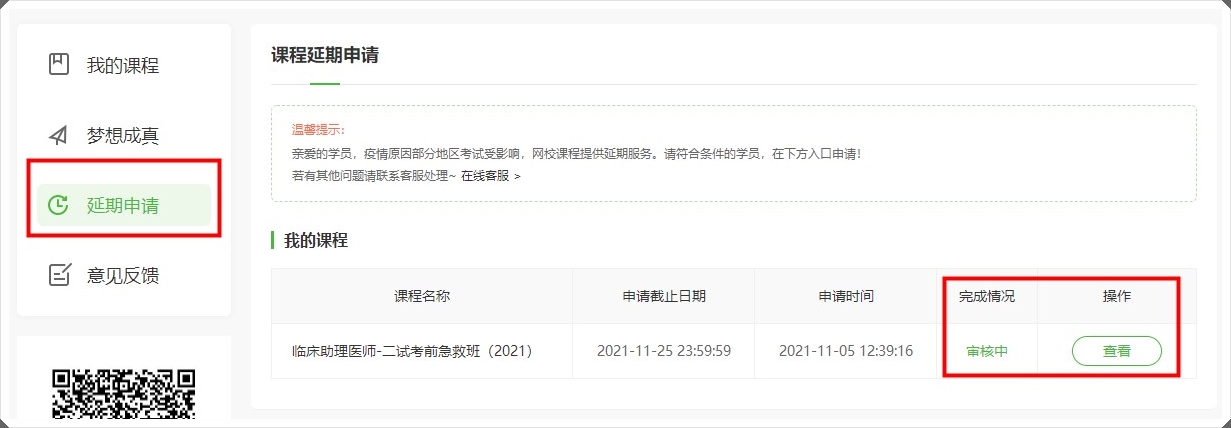 網(wǎng)校溫馨提醒:疫情影響部分地區(qū)考試受影響,醫(yī)學(xué)教育網(wǎng)網(wǎng)校課程提供延期服務(wù)。請(qǐng)符合條件的學(xué)員及時(shí)申請(qǐng)延期服務(wù)。各位學(xué)員可登陸醫(yī)學(xué)教育網(wǎng)——我的網(wǎng)校我的家,或者在醫(yī)學(xué)教育APP申請(qǐng)續(xù)學(xué)/延期服務(wù)。