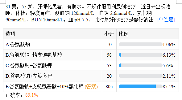 男,55歲。肝硬化患者,有腹水。不規(guī)律服用利尿劑治療,近日來出現(xiàn)嗜睡。體檢:輕度黃疸,測血鈉120mmol/L,血鉀2.6mmol/L,氯化物90mmol/L,BUN 10mmol/L,血pH 7.5。