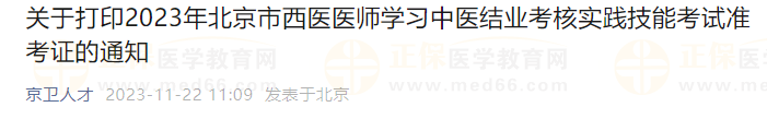 2023年北京市西醫(yī)醫(yī)師學(xué)習(xí)中醫(yī)結(jié)業(yè)考核實踐技能考試準(zhǔn)考證打印的通知