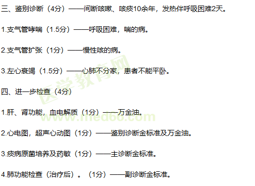 (3)醫(yī)學(xué)|教育網(wǎng)查體:雙肺叩診呈過清音,雙肺可聞及散在哮鳴音;胸部X線片;雙肺透亮度增高,膈肌低平。提示肺氣腫。(1分)——體征