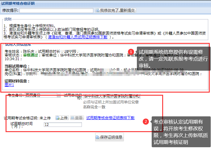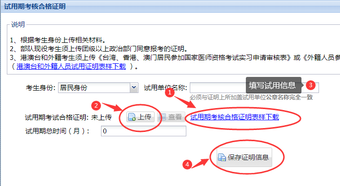 1.試用期考核證明上傳(僅針對前期未在試用期申報系統(tǒng)中填報的考生,前期已填報的無需上傳):下載樣表,根據(jù)自身取得執(zhí)業(yè)助理資格情況填寫紙質(zhì)版試用考核證明,經(jīng)過試用單位蓋章后上傳圖片資料,填寫試用單位信息后提交保存證明信息即可。
