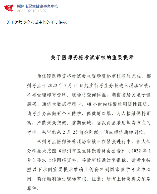 郴州考點2022年2月21日起實行醫(yī)師資格考生分批進入現(xiàn)場審核!
