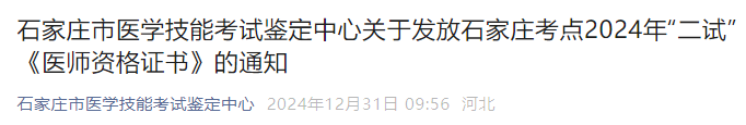 石家莊市醫(yī)學技能考試鑒定中心關于發(fā)放石家莊考點2024年“二試”《醫(yī)師資格證書》的通知