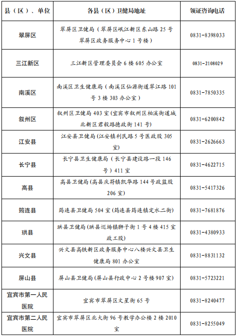 其中:報(bào)名時(shí)工作單位是宜賓市第一人民醫(yī)院、宜賓市第二人民醫(yī)院、宜賓市中醫(yī)院、宜賓市第四人民醫(yī)院、宜賓市疾病預(yù)防控制中心的考生,請到單位醫(yī)務(wù)部或人事部門領(lǐng)取,具體領(lǐng)取時(shí)間由單位自行決定。