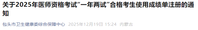 內(nèi)蒙古包頭2025年臨床助理醫(yī)師“一年兩試”考生速去注冊!內(nèi)蒙古2025年醫(yī)師資格“一年兩試”考生可以使用成績單進行注冊!請相關(guān)考生及時查看,盡早完成注冊。