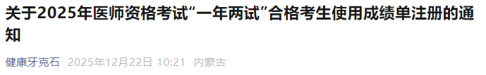 - · 內(nèi)蒙古通遼2025年臨床助理醫(yī)師“一年兩試”成績單注冊開始!