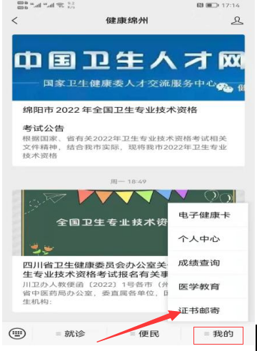 1.關(guān)注“健康綿州”微信公眾號(hào),選擇我的、證書郵寄;
