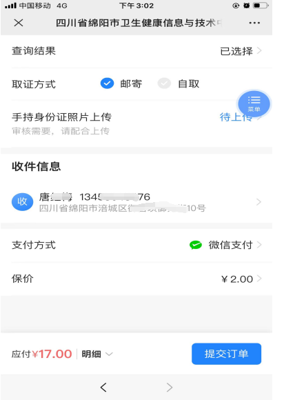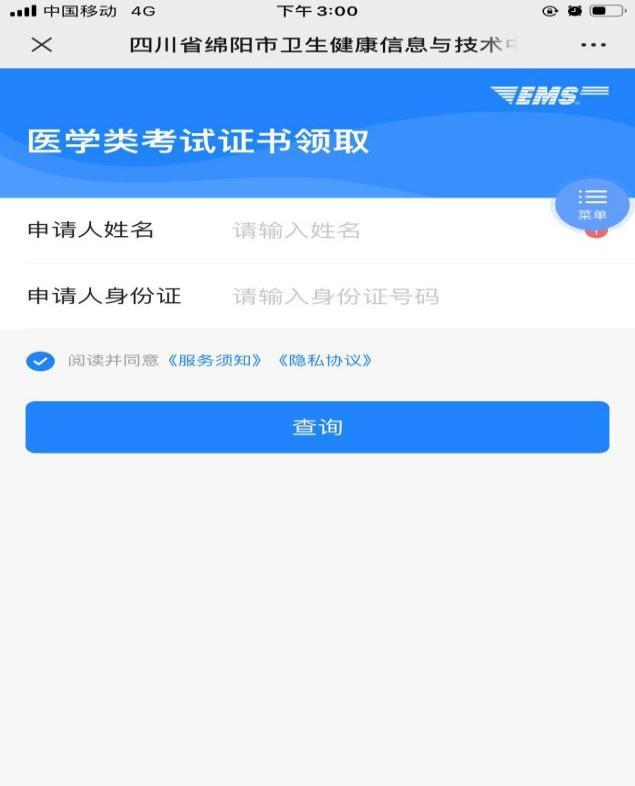 2022年1月,綿陽市衛(wèi)生健康信息與技術(shù)中心與中國郵政速遞物流公司綿陽分公司簽訂《綿陽市醫(yī)學(xué)類資格證書寄遞委托協(xié)議》。2021年取得《醫(yī)師資格證書》的醫(yī)務(wù)人員關(guān)注“健康綿州”微信公眾號(hào),選擇“我的”、“證書郵寄”,輸入申請(qǐng)人姓名和申請(qǐng)人身份證,可查詢是否取得2021年《醫(yī)師資格證書》,并填入相關(guān)信息,自愿進(jìn)行網(wǎng)上郵寄《醫(yī)師資格證書》并支付郵寄費(fèi)用。