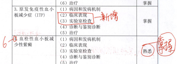 1.新增或刪除了某些要點(diǎn),以及學(xué)習(xí)要求的改變。如下圖增加了臨床表現(xiàn)和實(shí)驗(yàn)室檢查的內(nèi)容,這種只需復(fù)習(xí)時再把新增的內(nèi)容加到腦袋瓜里就行;涉及到學(xué)習(xí)要求改變的就需要我們根據(jù)變化調(diào)整學(xué)習(xí)重點(diǎn)了,像血栓性血小板減少性紫癜由熟悉改為了掌握,也就意味著這部分內(nèi)容復(fù)習(xí)的時候也要著重復(fù)習(xí)了。