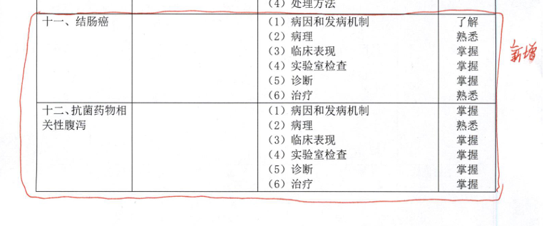 2.刪除或新增了某些細(xì)目。如下圖增加了結(jié)腸癌和抗菌藥物相關(guān)性腹瀉,刪除的好說,新增的疾病就需要著重復(fù)習(xí)了。