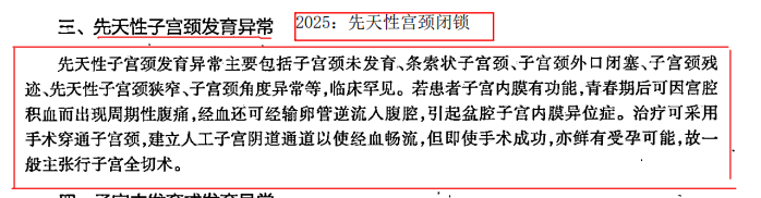 2025年:②副中腎管衍化物發(fā)育不全所致異常,包括無子宮、無陰道、痕跡子宮、子宮發(fā)育不良、單角子宮、始基子宮、輸卵管發(fā)育異常;③副中腎管衍化物融合障礙所致異常,包括雙子宮、雙角子宮、鞍狀子宮和縱隔子宮等。