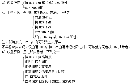 (1)甲型肝炎:抗HAV IgM陽(yáng)性;糞便中檢出HAV顆?;蚩乖騂AV RNA。