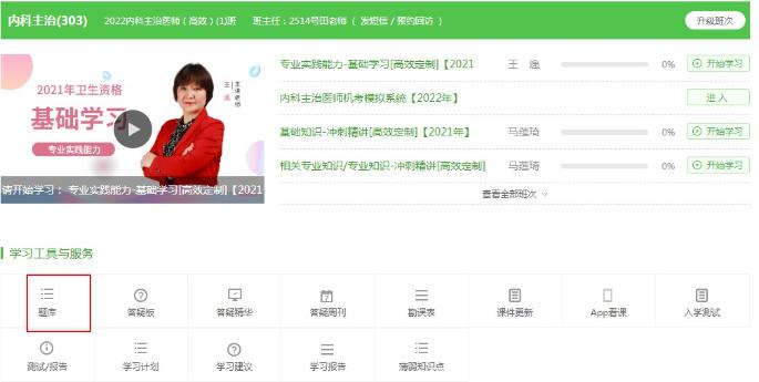 登錄學(xué)員代碼,進(jìn)入我的網(wǎng)校我的家-我的課程,在“學(xué)習(xí)工具與服務(wù)”中,點(diǎn)擊題庫。