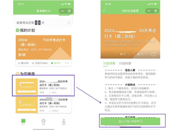 第三步:選擇打卡計(jì)劃,如“2024內(nèi)科主治醫(yī)師20天考點(diǎn)打卡(第二階段)”,點(diǎn)擊下方“加入計(jì)劃開始學(xué)習(xí)”,進(jìn)入學(xué)習(xí)知識(shí)點(diǎn)并答題。