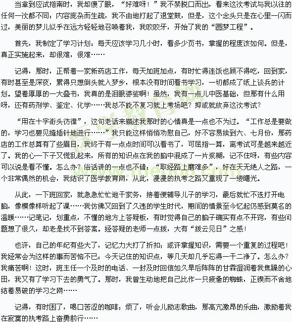 編者按:在醫(yī)學(xué)教育網(wǎng)“我的醫(yī)考之路”大型征文活動中涌現(xiàn)出很多考生原創(chuàng)的經(jīng)典文章,其中有位執(zhí)業(yè)藥師考生根據(jù)其備戰(zhàn)執(zhí)業(yè)藥師考試的親身經(jīng)歷,記錄下了“我的醫(yī)考之路——懷念難忘的執(zhí)考歲月”!