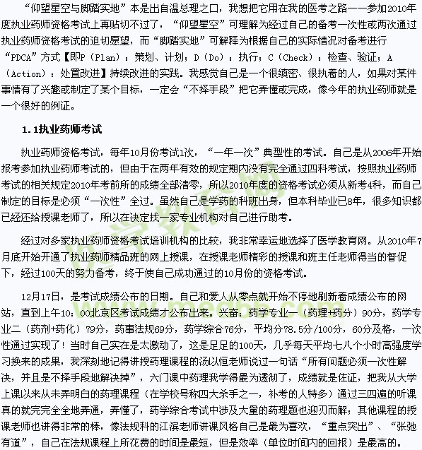 編者按:2010年執(zhí)業(yè)藥師學(xué)員wlka***根據(jù)自己執(zhí)業(yè)藥師考試的經(jīng)驗(yàn),在醫(yī)學(xué)教育網(wǎng)“我的醫(yī)考之路”大型征文活動(dòng)中寫下《我的醫(yī)考之路——仰望星空與腳踏實(shí)地》一文,與廣大奮斗在2011年執(zhí)業(yè)藥師考試第一線的朋友們分享,幫助更多考生通過考試!