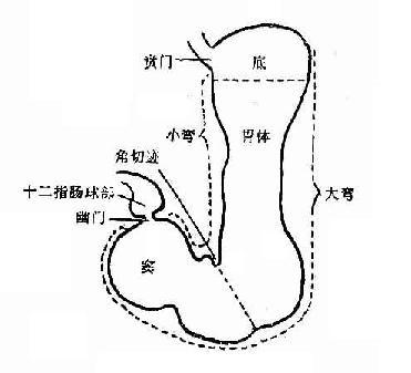 胃分胃底、胃體、胃竇三部分及胃小彎和胃大彎。如圖: