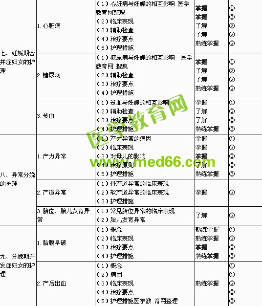 | 7.過期妊娠 | (1)病因、病理 (2)治療要點 (3)護理措施 | 了解 掌握熟練 掌握 | ① ② ③ | |