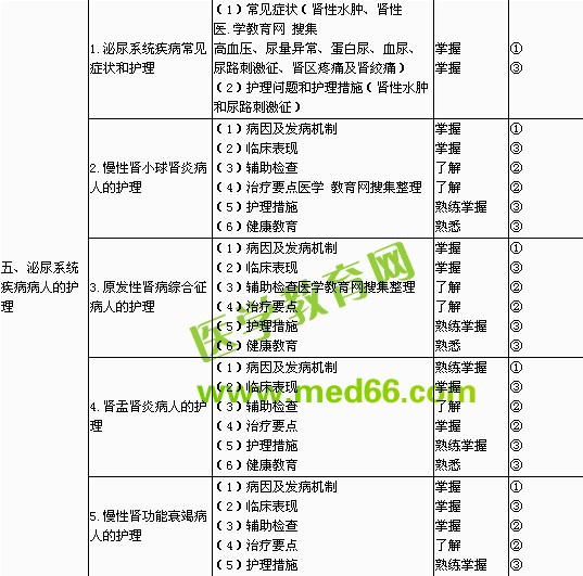 | 4.內(nèi)科病人心理護理及疾病各期病人的護理 | (1)急性病期護理(特點、護理措施) (2)慢性病期護理(特點、護理醫(yī)學(xué)教育.網(wǎng)整理 措施) (3)危重病期護理(特點、護理措施) (4)康復(fù)期護理(特點、護理措施) (5)老年患者護理(特點、護理措施) | 熟練掌握 | ③ | |