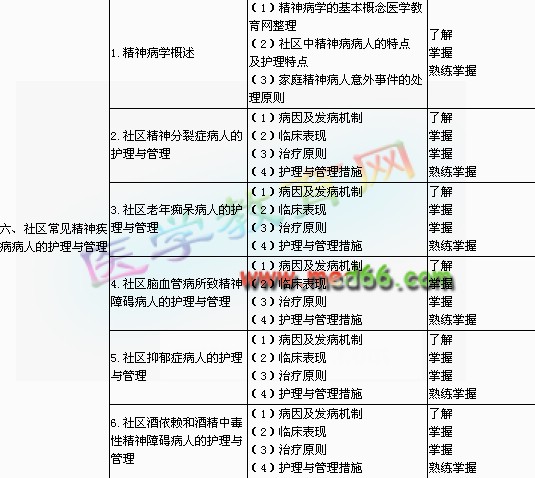 | 3.社區(qū)護理 | (1)社區(qū)護理的概念 (2)社區(qū)護理的發(fā)展過程 (3)社區(qū)護士的角色 (4)社區(qū)護士的能力要求 |