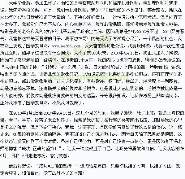 編者按:在醫(yī)學(xué)教育網(wǎng)“我的醫(yī)考之路”大型征文活動(dòng)中有很多的學(xué)員踴躍參與,臨床執(zhí)業(yè)醫(yī)師學(xué)員根據(jù)自己2010年臨床執(zhí)業(yè)醫(yī)師考試的經(jīng)驗(yàn),寫下了《我的醫(yī)考之路——成功=正確的堅(jiān)持》一文,與廣大奮斗在2011年醫(yī)學(xué)考試第一線的朋友們分享!