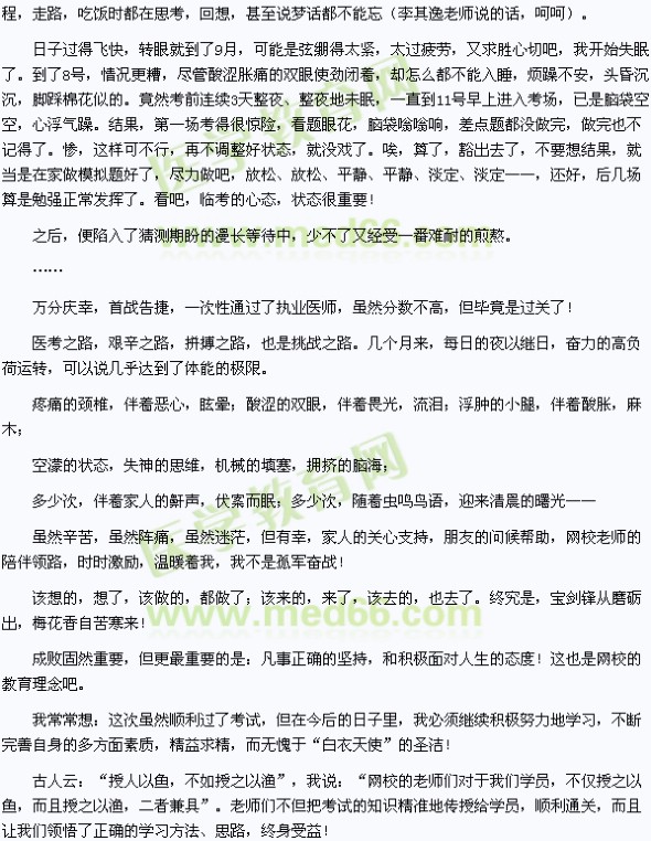 編者按:臨床執(zhí)業(yè)醫(yī)師學(xué)員bks110***通過參加2010年執(zhí)業(yè)醫(yī)師考試,在醫(yī)學(xué)教育網(wǎng)征文活動中記錄下自己的醫(yī)考之路,即我的醫(yī)考之路——“授人以魚,授之以漁”。