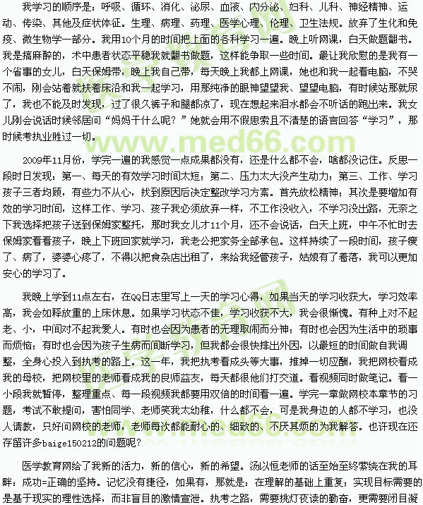 我的醫(yī)考之路戰(zhàn)線拉的比較長——三年。因為我是從零開始,2000年衛(wèi)校畢業(yè),一直在鄉(xiāng)鎮(zhèn)衛(wèi)生院工作,2003、2004年考兩年執(zhí)助。為了確保執(zhí)業(yè)一次通過,2008年我偶爾看一些西安交大醫(yī)學(xué)院的網(wǎng)上授課視頻。覺得這樣的授課方式很好。2009年初我在網(wǎng)上看到了醫(yī)學(xué)教育網(wǎng),我突然感到我的救星出現(xiàn)了。這樣的學(xué)習(xí)方式太適合我這個從零開始的學(xué)生。