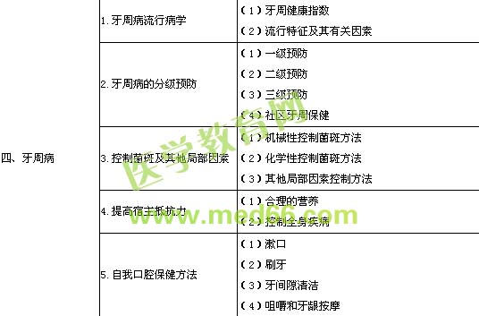 | 4.口腔健康教育和口腔健康促進(jìn)的計(jì)劃、實(shí)施與評(píng)價(jià) | (1)確立口腔健康目標(biāo) (2)口腔健康教育和口腔健康促進(jìn)的計(jì)劃 (3)口腔健康教育和口腔健康促進(jìn)的實(shí)施 (4)口腔健康教育和口腔健康促進(jìn)的評(píng)價(jià) | |