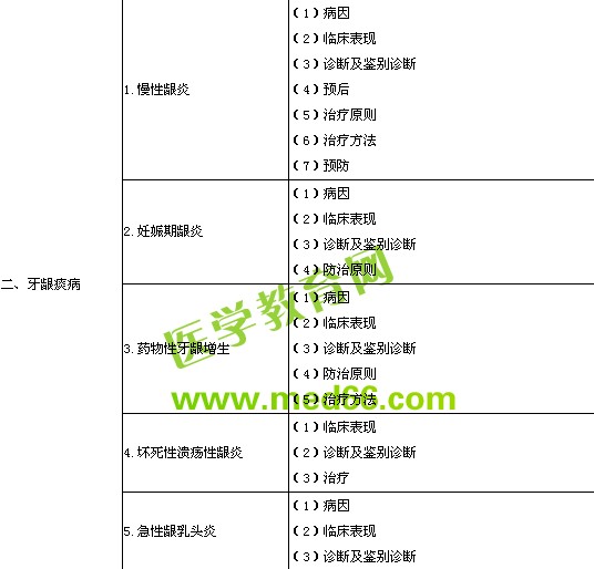 | 4.牙周一牙髓聯(lián)合病變 | (1)牙周組織和牙髓的解剖通道 (2)臨床類型及表現(xiàn) (3)治療原則 | |