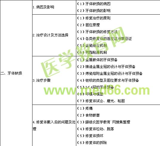 | 2.治療設(shè)計及方法選擇 | (1)固定義齒與可摘局部義齒的適應(yīng)證與禁忌證 (2)固定義齒的分類 (3)固定義齒的基牙選擇 (4)固定義齒的設(shè)計醫(yī)學(xué)教育`網(wǎng)搜集整理 (5)可摘局部義齒的組成、基本要求 (6)Kennedy分類法及可摘局部義齒設(shè)計原則 (7)各類牙列缺損的可摘局部義齒設(shè)計要點 (8)種植義齒的組成、結(jié)構(gòu)和修復(fù)治療原則 | |