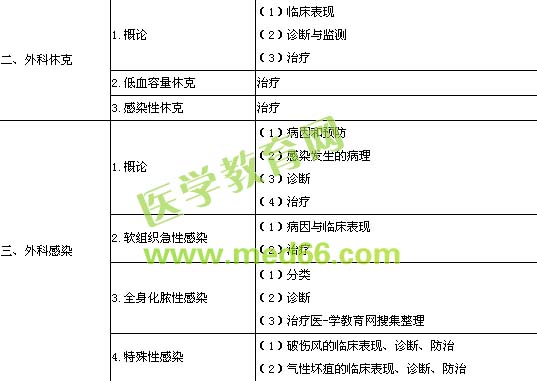 | 一、水、電解質(zhì)代謝和酸堿平衡失調(diào) | 1.水和鈉的代謝紊亂 | (1)病因 (2)臨床表現(xiàn) (3)診斷 (4)治療 | |