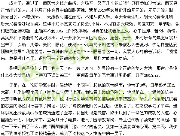 當時考試的時候,我生病了,一直發(fā)燒到38度左右(有好幾天),因為時間的關系,我只是吃了點藥,沒來及打點滴便上了考場,那兩天可真是燒糊涂了,有很多題,明明很簡單,愣是一下子做不出來。還有,填涂答題卡的時候,也是稀里糊涂的??纪旰蠡氐郊抑?,看著同學們一個個都把試題上傳至網(wǎng)上,而我卻好像什么印象都沒有,更別提什么估分了。心想,今年肯定完了,肯定要二進宮了。但我仍然堅持每天進入醫(yī)學教育網(wǎng),看看里面關于醫(yī)考的動態(tài)。12月8日下午,分數(shù)線終于出來了,我心里真的說不出是什么滋味,查分,肯定過不了多久就會開始了。我守在電腦前,心情忐忑不安,后來索性把電腦關了。直到9日凌晨,同事打來電話說可以查分了。哎,丑媳婦總要見公婆面,我打開了電腦,進入國家醫(yī)學考試中心查詢,可怎么也進不去,可能是那天查分的考生特別多、網(wǎng)絡擁堵的緣故吧!后來大概過了兩個小時左右,我才進入了考試中心網(wǎng)站,一查成績,422分。??!我終于過了,盡管分數(shù)不是很高。我當時真是又驚又喜,興奮、激動的眼淚都掉了下來,真可謂是喜極而泣。這大半年的辛苦努力,終于得到了肯定。