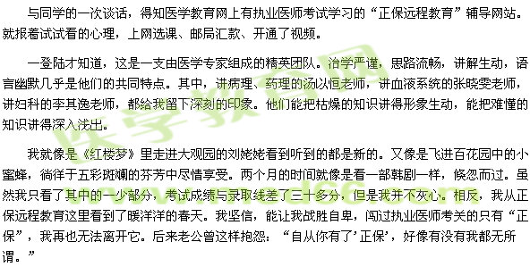 在這喜悅的日子里,我不僅感謝默默支持和鼓勵我的老公,更要感謝醫(yī)學(xué)教育網(wǎng)在我執(zhí)業(yè)醫(yī)師考試道路上的莫大幫助和指導(dǎo)。激動之余,與“正保遠(yuǎn)程教育”相伴的點點滴滴如戀愛時與老公相處的一幕幕鏡頭,歷歷在目。