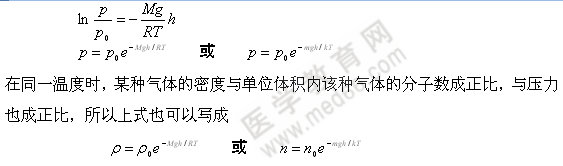 這些式子均稱為Boltzmann公式,它指出了分子在重力場(chǎng)的分布規(guī)律。空氣是以N2,O2及少量其它氣體如CO,Ar等的混合物,由于不同氣體摩爾質(zhì)量不同,因此在地面上空氣的組成與高空處不同醫(yī)\學(xué)教育網(wǎng)搜集整理。