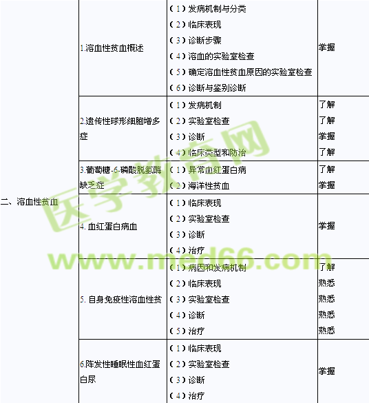 | 4.再生障礙性貧血 | (1)分型 (2)病因和發(fā)病機(jī)制 (3)急性再障和慢性再障的臨床表現(xiàn)及實(shí)驗(yàn)室檢查 (4)診斷與鑒別診斷 (5)治療 |