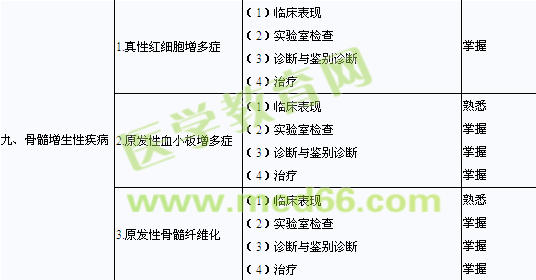 | 七、多發(fā)性骨髓瘤 | (1)病因和發(fā)病機(jī)制 (2)病理生理和臨床表現(xiàn) (3)實(shí)驗(yàn)室和其他檢查 (4)診斷與鑒別診斷 (5)治療 |