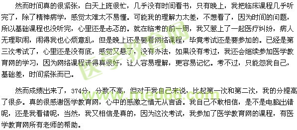 第一次接觸醫(yī)學(xué)教育網(wǎng),但是我已經(jīng)是第三次考醫(yī)師了。錯(cuò)過(guò),就是罪過(guò),以前兩次不知道醫(yī)學(xué)教育網(wǎng),也不怎么相信網(wǎng)絡(luò),感覺(jué)太虛太假。然而第一次考試,自己看書,失敗告終,305分,很悲哀;第二次,還是自己看書,還是失敗,317分,很可悲的,自己努力了并沒(méi)有多大的提高,遠(yuǎn)離分?jǐn)?shù)線還差甚遠(yuǎn)。怎么辦呢?如何才能通過(guò)考試呢?我是個(gè)大專生,可能基礎(chǔ)比較差、底子薄,要想通過(guò)考試真的不容易嗎?然而偶然的機(jī)會(huì)聽別人說(shuō)起醫(yī)學(xué)教育網(wǎng)。我抱著試試看的心理,報(bào)名參加了網(wǎng)絡(luò)課程。在臨床上班白天沒(méi)有時(shí)間,只有晚上抽出時(shí)間學(xué)習(xí)。自己看書還是沒(méi)有方向感,不知其所以然,參加網(wǎng)絡(luò)課程,讓我有了方向感,有了學(xué)習(xí)的激情。當(dāng)然也有學(xué)習(xí)疲倦的時(shí)候,學(xué)習(xí)累的時(shí)候也去論壇里看看曾經(jīng)考過(guò)的學(xué)員寫的感悟。這些感悟也給了我動(dòng)力。還有湯老師的一些肺腑之言:成功等于正確的堅(jiān)持等等。