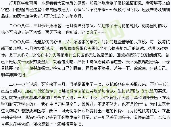 編者按:醫(yī)學(xué)教育網(wǎng)“我的醫(yī)考之路”大型征文活動(dòng)中很多的學(xué)員踴躍參加,臨床執(zhí)業(yè)醫(yī)師學(xué)員張**根據(jù)自己2012年的醫(yī)師考試經(jīng)驗(yàn),記錄下:我的醫(yī)考之路——難行卻勇往直前: