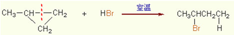 當(dāng)環(huán)丙烷的烷基衍生物與氫鹵酸作用時,碳環(huán)開環(huán)多發(fā)生在連氫原子最多和連氫原子最少的兩個碳原子之間。氫鹵酸中的氫原子加在連氫原子較多的碳原子上,而鹵原子則加在連氫原子較少的碳原子上。例如: