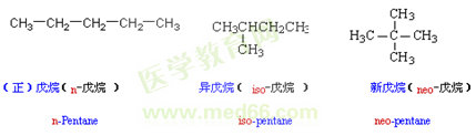 烷烴的英文名稱是在meth-,eth-,prop-,but- 等表示碳原子數的詞頭后,加上詞尾-ane.烷烴異構體可用詞頭“正(normal或n-)、異(iso或i-)、新(neo)”來區(qū)分。“正”表示直鏈烷烴,常??梢允÷?。“異”表示末端為