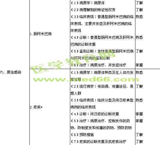 | 二、病毒感染 | 1.病毒性肝炎* | (1)病原學(xué):肝炎病毒的種類及其抗原抗體系統(tǒng) (2)流行病學(xué):甲型、乙型、丙型和戊型肝炎的傳染源、傳播途徑及人群易感性醫(yī)學(xué)教育網(wǎng)搜集整理 (3)臨床表現(xiàn):病毒性肝炎的臨床分型及各型病毒性肝炎的臨床癥狀和體征 (4)各型病毒性肝炎的診斷 (5)慢性病毒性肝炎的治療,包括抗病毒治療 (6)重型肝炎的治療 (7)預(yù)防:甲型、乙型病毒性肝炎的預(yù)防 |