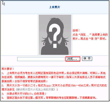 在上傳照片界面,仔細(xì)閱讀紅色提示,點(diǎn)擊“瀏覽”。見下圖:
