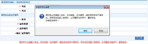 d) 請(qǐng)考生特別注意,您在此處輸入的姓名和證件編號(hào)將作為您成績(jī)單及合格證書的標(biāo)識(shí),請(qǐng)認(rèn)真填寫。報(bào)名信息填寫完畢并保存后將無法修改,如填寫有誤,請(qǐng)重新注冊(cè)、重新填報(bào)信息。見下圖: