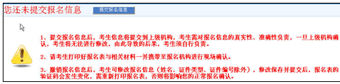 在“提交/撤銷提交報(bào)名信息”界面,仔細(xì)閱讀紅色提示,點(diǎn)擊“提交報(bào)名信息”即可。提交后,如需撤銷提交,點(diǎn)擊“撤銷提交報(bào)名信息”即可。見下圖: